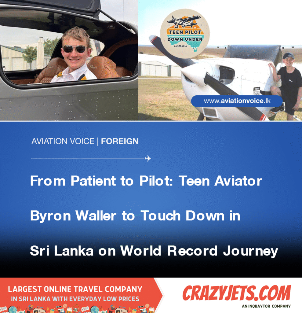 Fifteen-year-old Australian pilot Byron Waller is set to arrive in Sri Lanka today, 17 August 2025, as part of his mission to become the youngest supported pilot to fly around the world. Living with Crohn’s disease, Byron has embarked on this remarkable journey under the campaign Teen Pilot Down Under, aiming to raise global awareness about youth resilience and chronic illness.