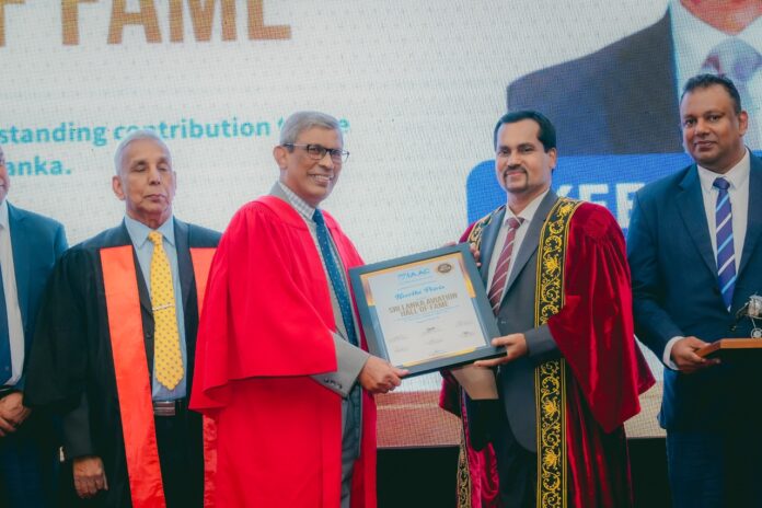 The Hall of Fame Certificate was formally presented to Mr. Keerthi Peiris by Mr. Sunil Jayaratne, Chairman of the Civil Aviation Authority of Sri Lanka, in honor of his lifelong dedication and remarkable achievements in the field of aviation.