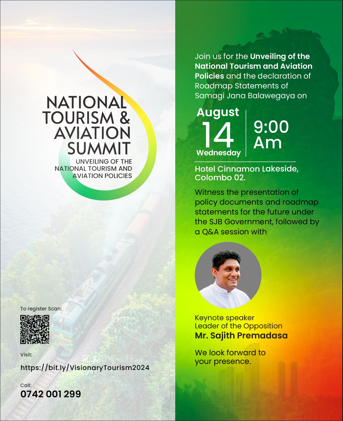 The Samagi Jana Balawegaya (SJB) is set to launch its much-anticipated National Tourism and Aviation Policies tomorrow, 14 August 2024, at a special event at Cinnamon Lake Side Colombo. The event is expected to draw attention from key stakeholders in the tourism and aviation sectors, as well as government officials, industry experts, and the media.
