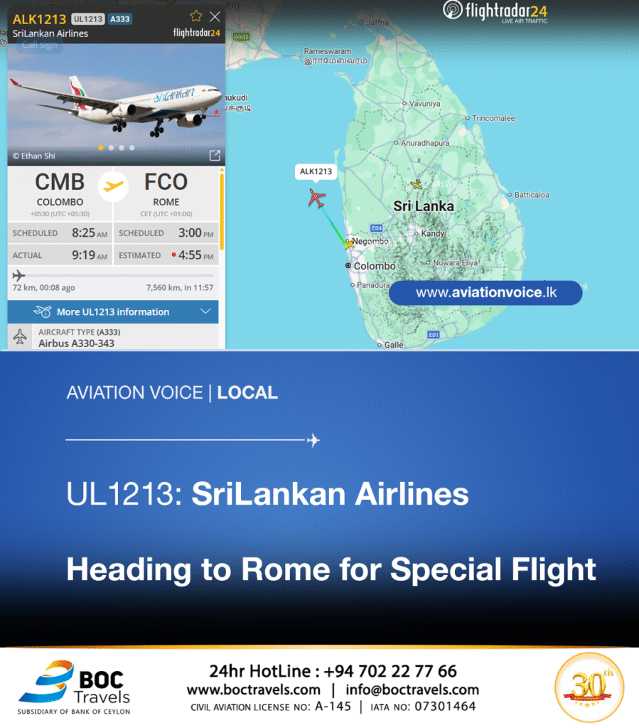 SriLankan Airlines is operating a special flight to Rome Fiumicino Airport today (09) under flight number UL1213 to assist passengers affected by recent travel disruptions. The flight is being operated using an Airbus A330-343 aircraft.